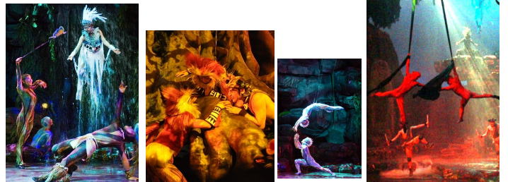 水と大地そして火の精霊たちに扮したダンサーが魅せる、アクロバティックなパフォーマンスと生演奏、本物の火と水を使った演出で臨場感あふれる圧巻のステージが持ち味。