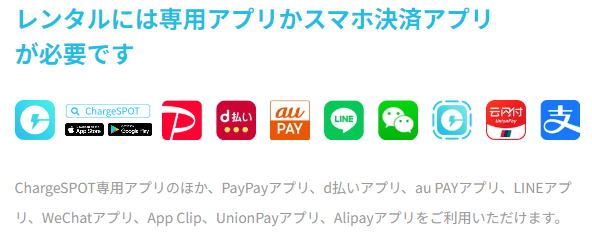 申請はChargeSPOT公式アプリのほかにも、LINEや、PayPay、D払い、auペイ、WeChatなどのスマホ決済用アプリ「スマホ充電」サービス等々でも行えるので、1度利用するだけならばこちらの各スマホ決済アプリが便利かもしれません。