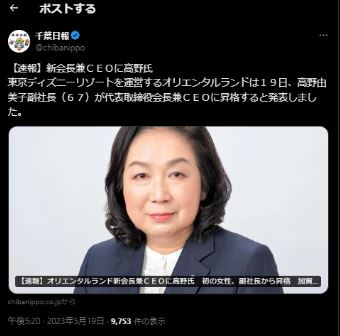 東京ディズニーリゾートを運営するオリエンタルランドは19日、高野由美子副社長(67)が代表取締役会長兼CEOに昇格すると発表しました。https://t.co/69YK7qcIP3